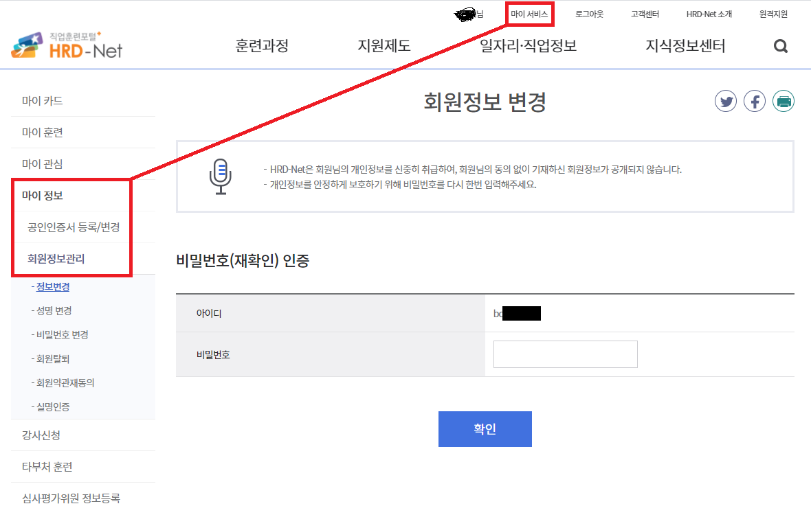 혹은 [마이서비스]-[마이정보]- [회원정보관리]-[정보변경]에서 ID를 확인한다