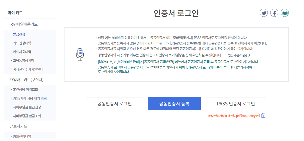 국민내일배움카드를 신청하려면 홈페이지 로그인과 상관없이 인증서 로그인을 해야합니다.