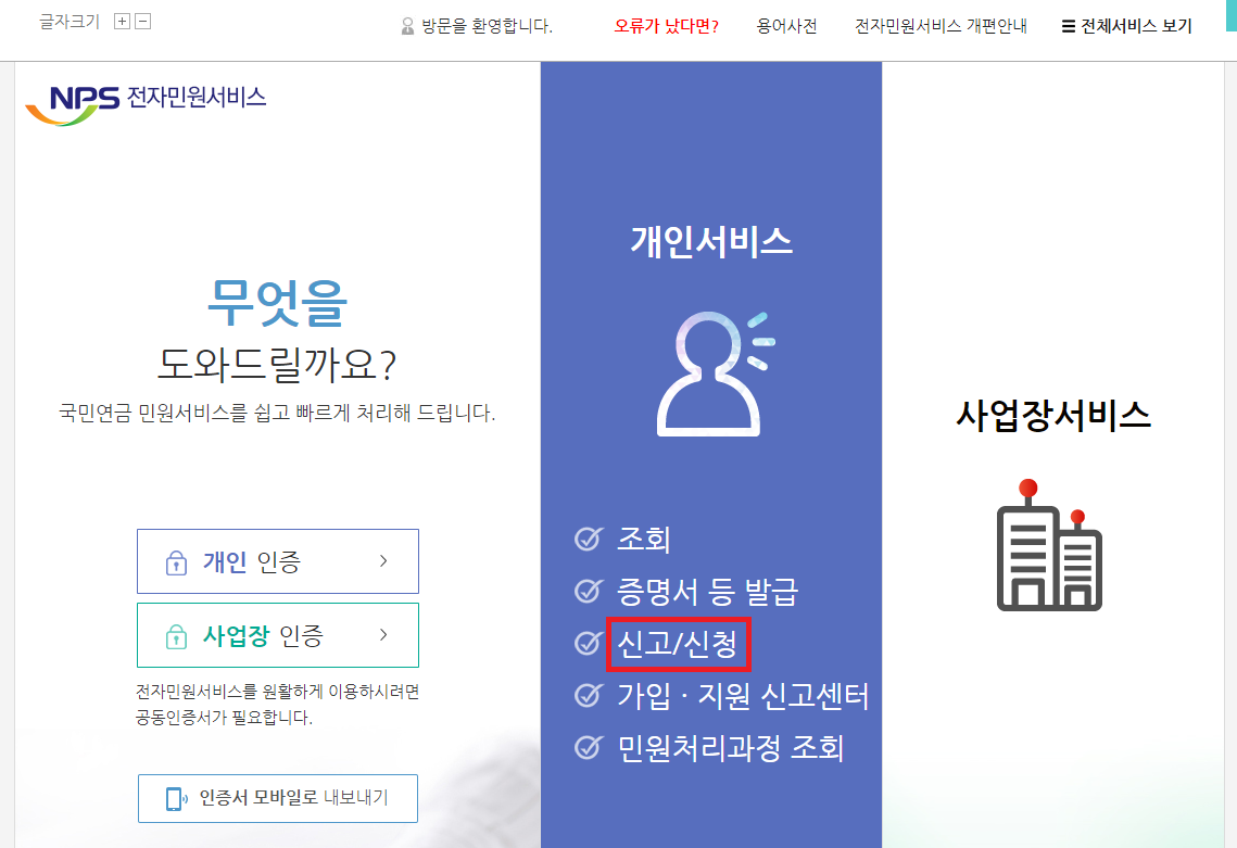 3) 개인서비스 - 신고/신청을 클릭한다.