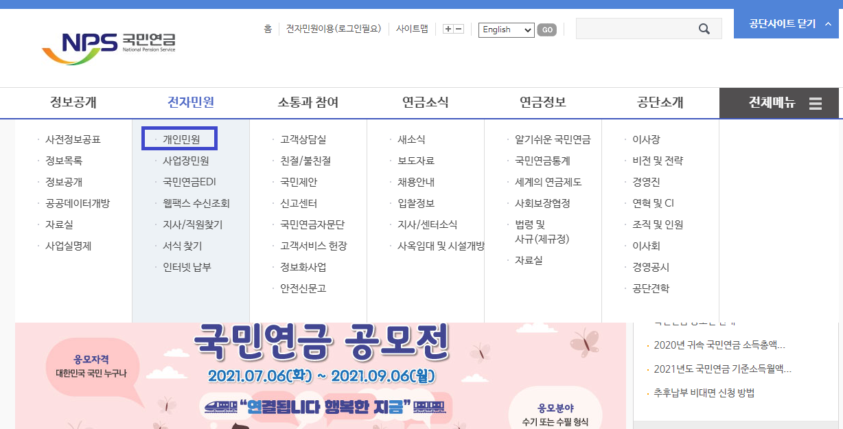 1) 국민연금공단 홈페이지에서 [전자민원]-[개인민원]을 클릭한다.