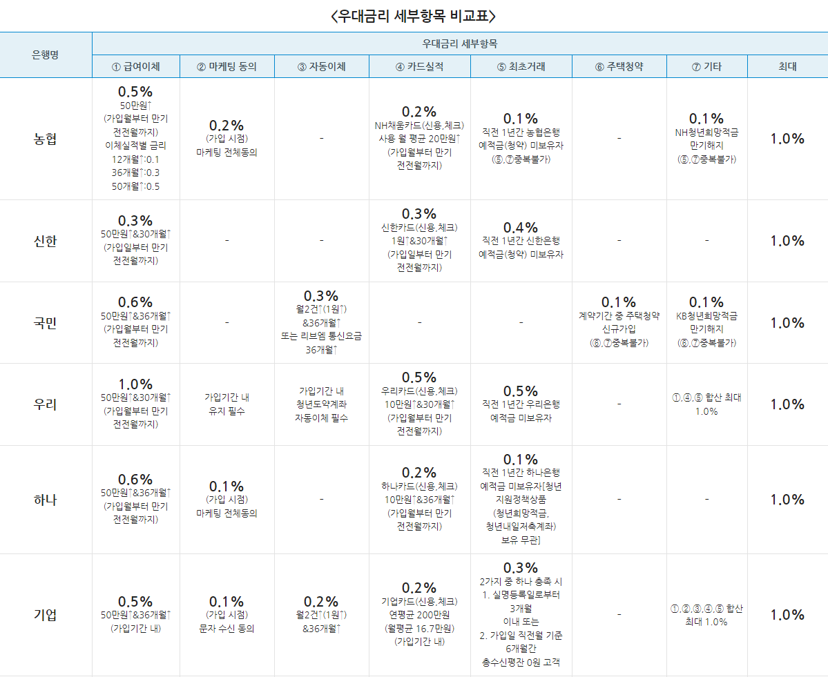 은행마다 우대금리와 내용이 살짝씩 다르니까 은행별로 정리해서 올리도록 할게요!