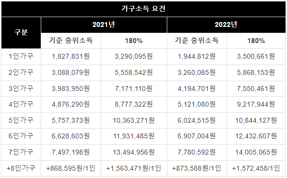 기준 중위소득의 180%이하여야 하므로 각 가구에 맞게 확인해보셔야 합니다.