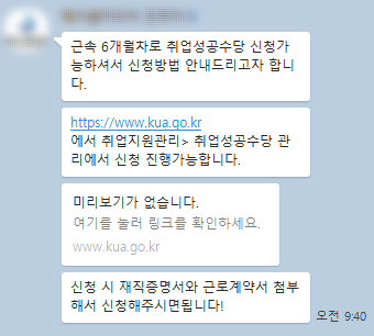 6개월 근속 취업성공수당을 받으라고 연락이 왔어요!