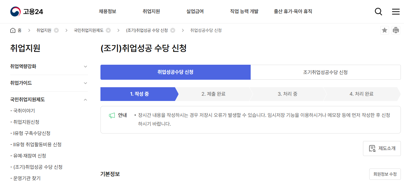 고용 24 -> 취업지원관리 -> 취업성공수당 신청에서 가능해요!