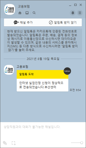 카톡으로 고용보험에서 인터넷 실업인정 신청이 정상적으로 전송되었다는 카톡알림도 오더라구요~
