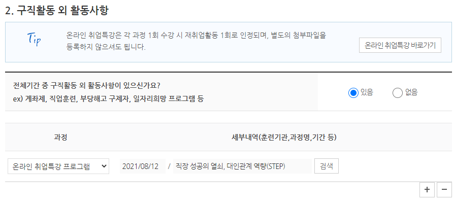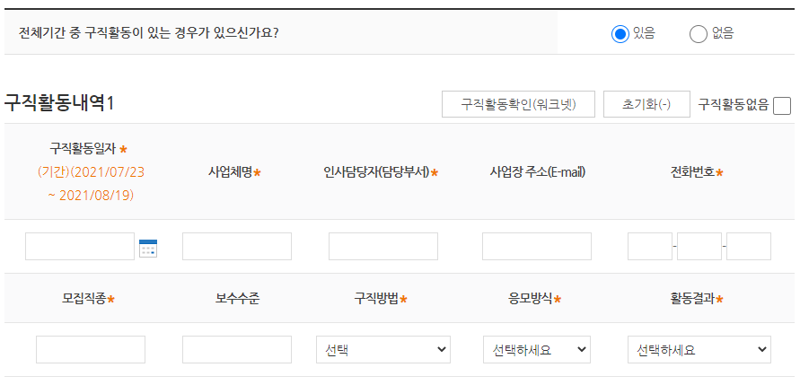 전체기간 중 구직활동이 있는 경우가 있으신가요? 무조건 1회 이상 있어야 하는거 아시죠?