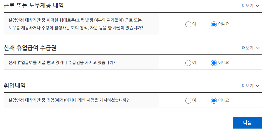 근로 또는 노무제공 내역, 산재 휴업급여 수급권, 취업내역에 해당이 없을경우 전부 아니오를 선택합니다.
