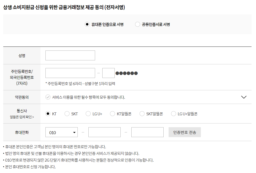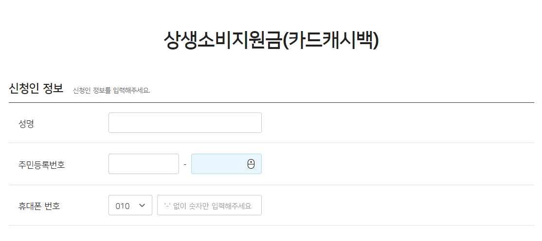 상생소비지원금 신청인정보(이름, 주민등록번호, 휴대폰번호)를 입력한 다음,