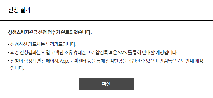 그렇게 신청하고 나니 우리카드 상생소비지원금 신청접수가 완료되었습니다. 라는 팝업이 뜨더라구요~