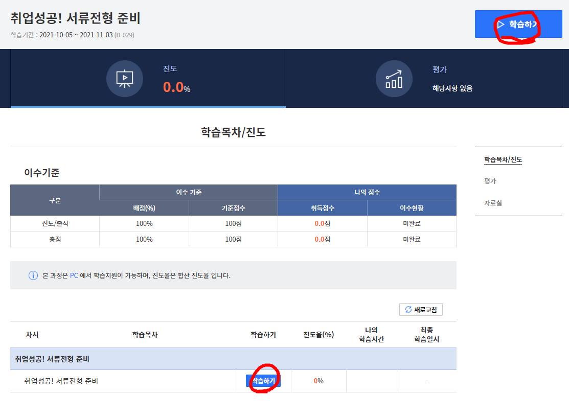 7. 내가 신청한 과정이 맞는지 확인한후, [학습하기]를 누른다.