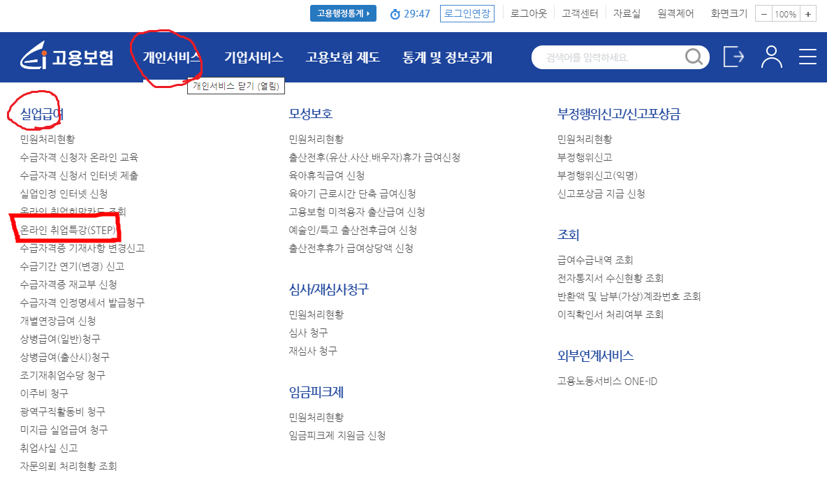 2. [개인서비스] - [실업급여] - [온라인 취업특강(STEP)]에 들어간다.